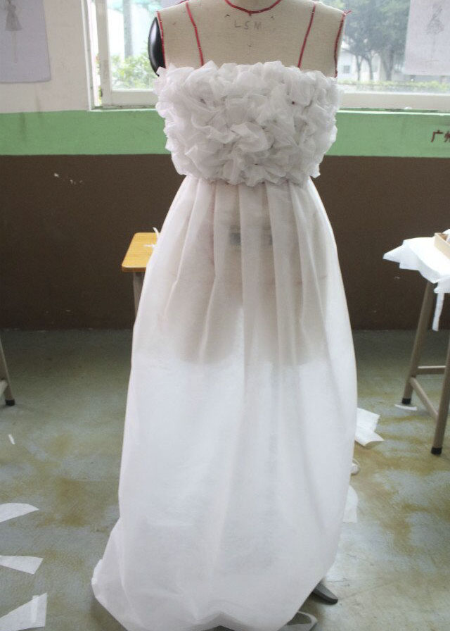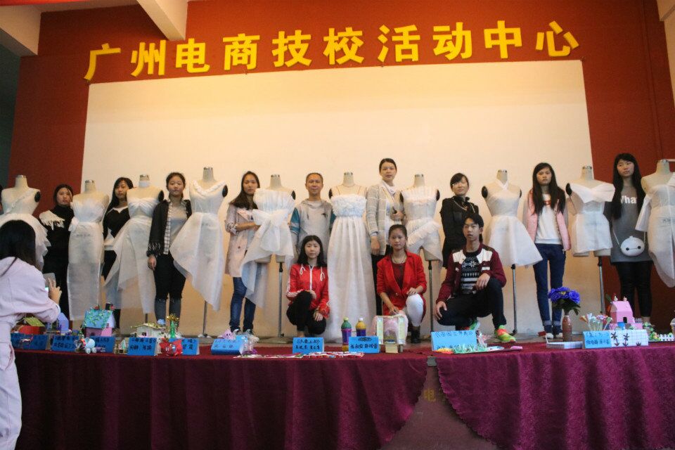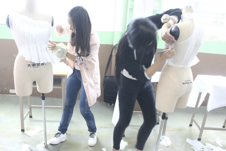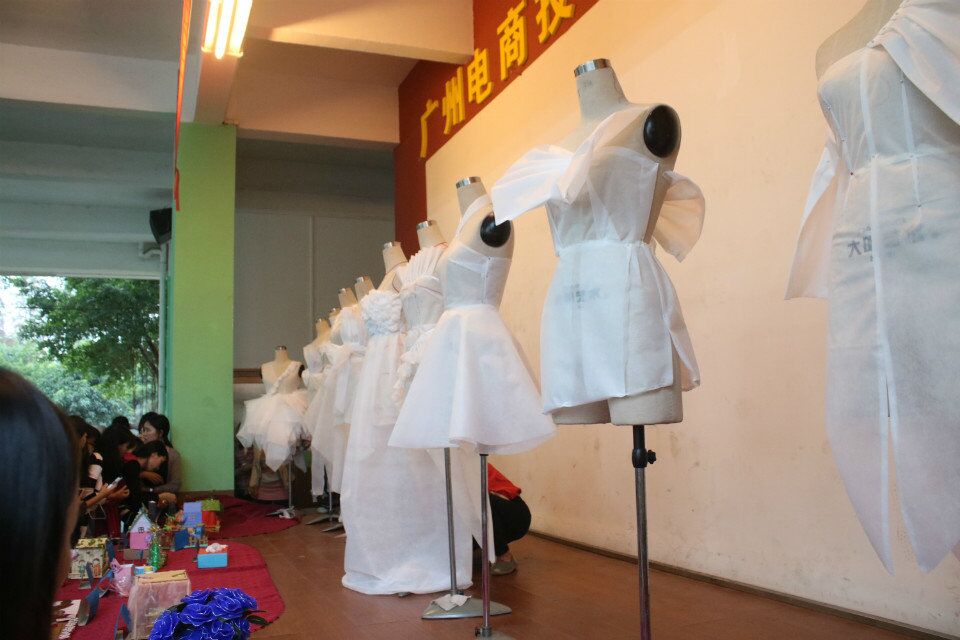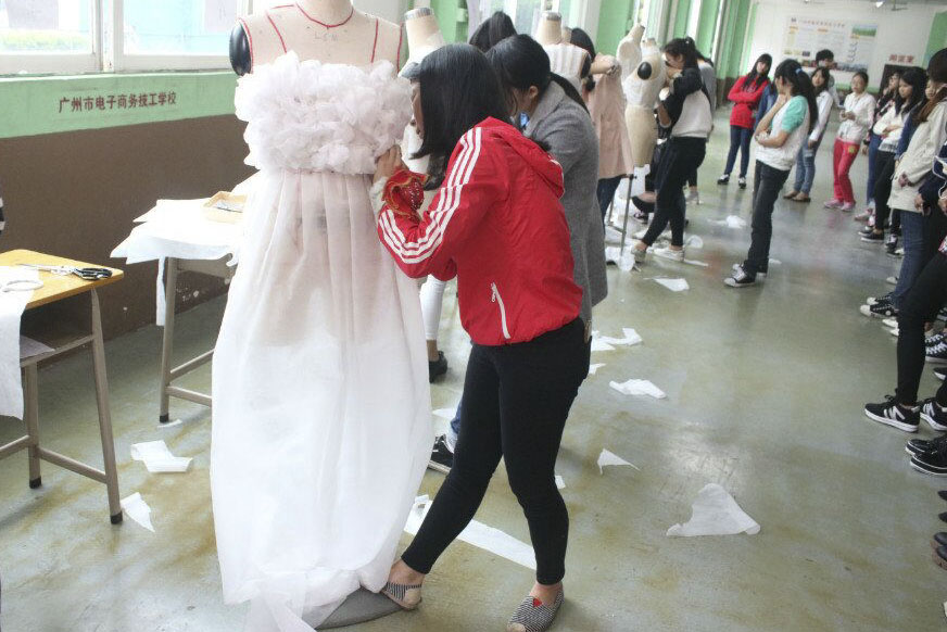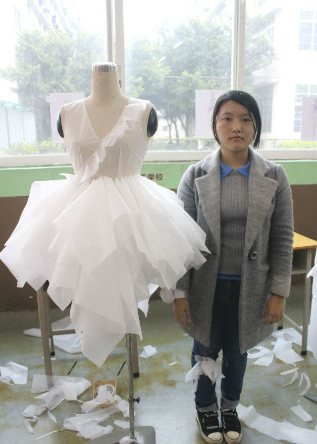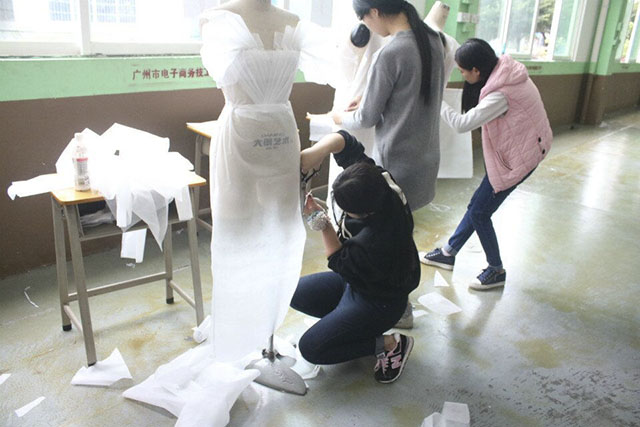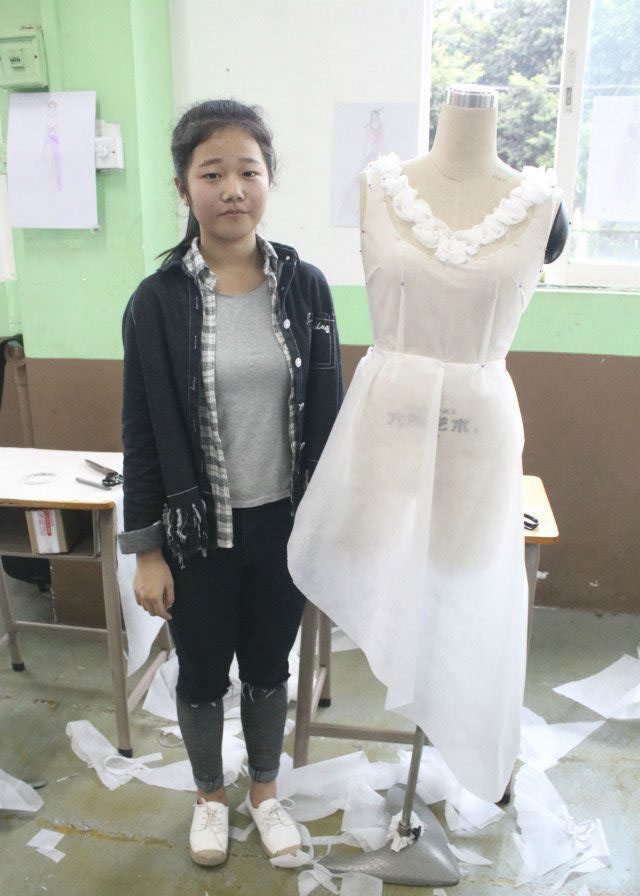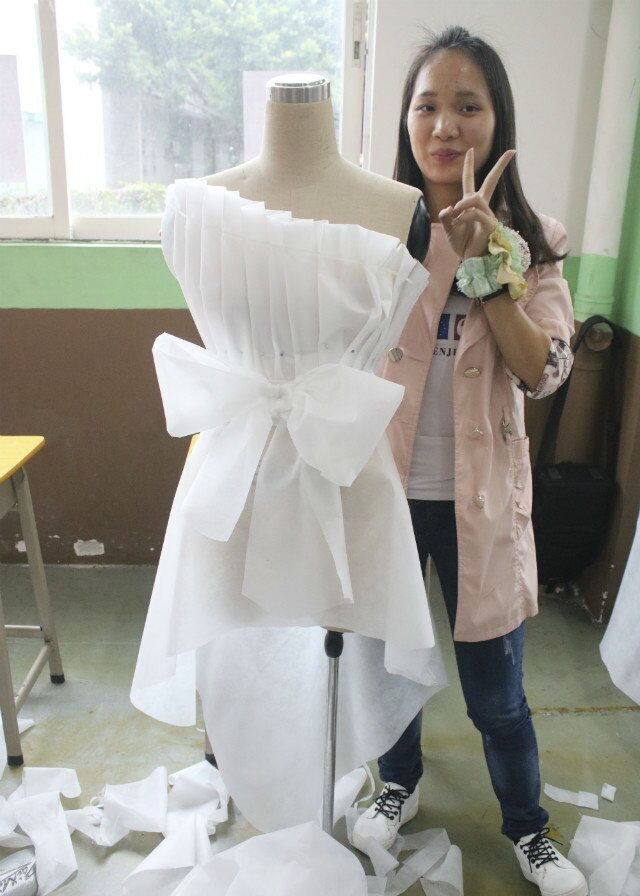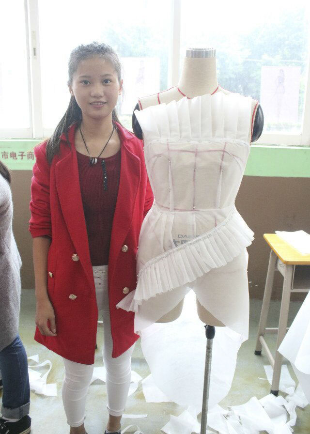 14级服装专业现场立体裁剪作品展,学生和作品合影