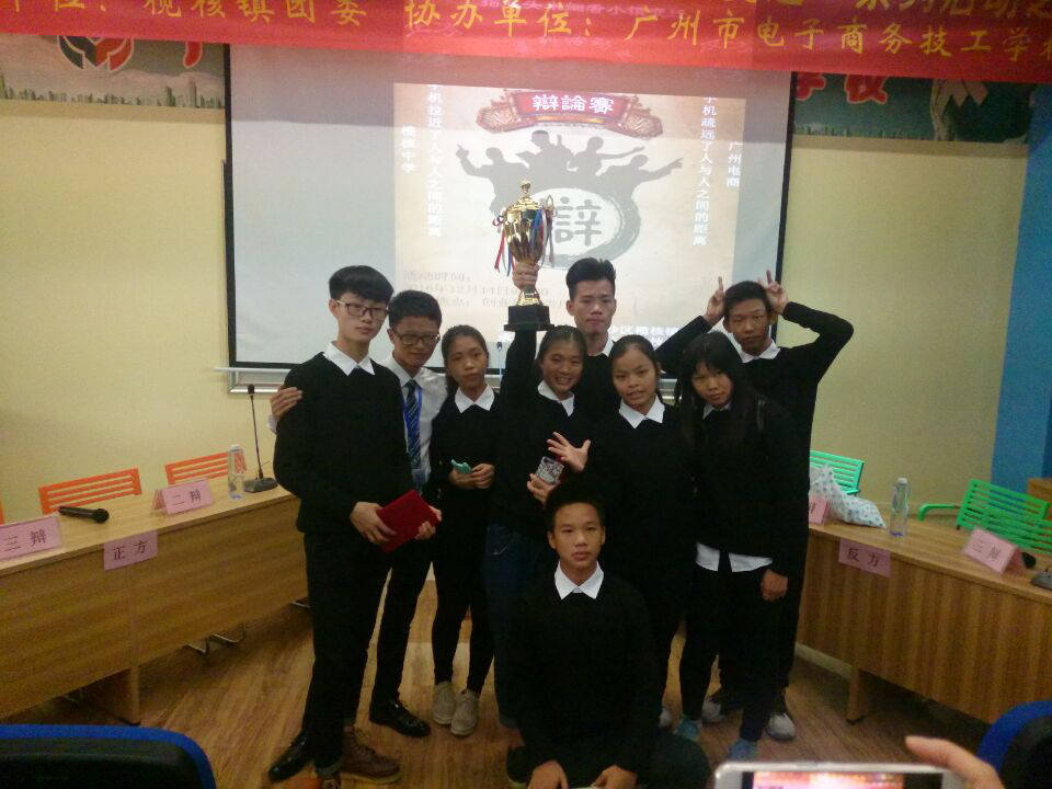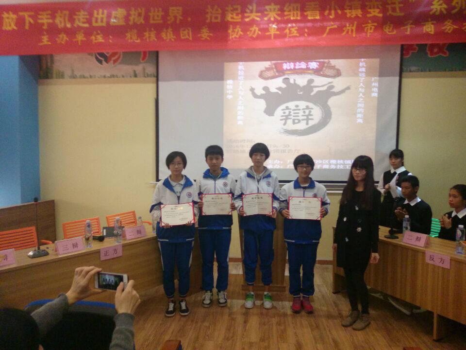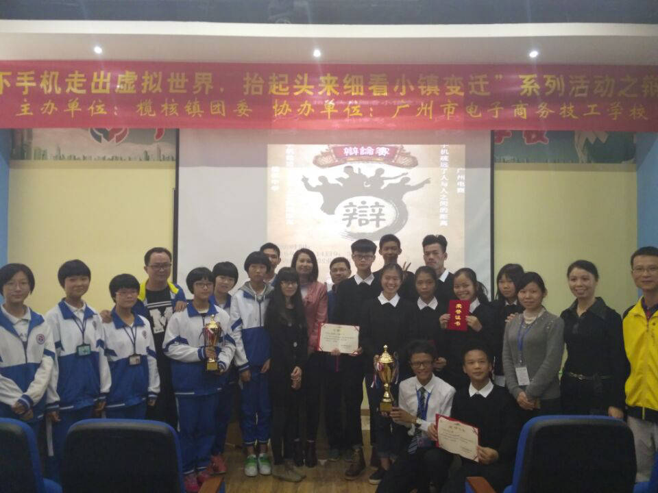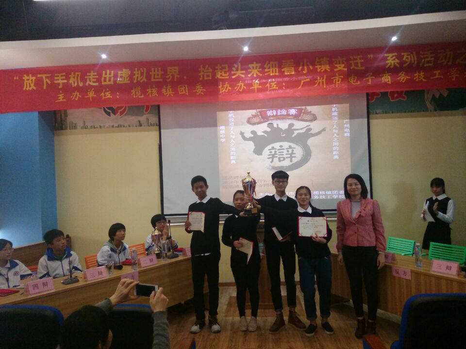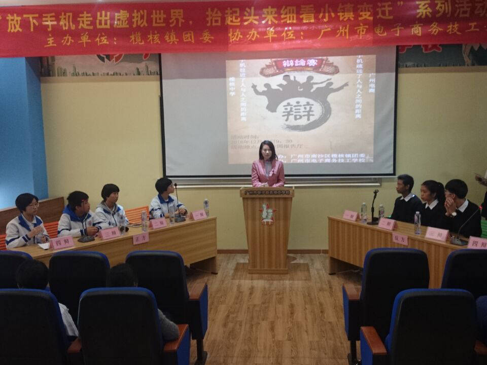 此次辩论赛双方为正方榄核中学和反方广州电商(即我校),同时有幸邀请到榄核镇团委书记林晓莹书记莅临指导。辩论双方围绕“手机拉近还是疏远人与人之间的距离”展开激烈辩论。