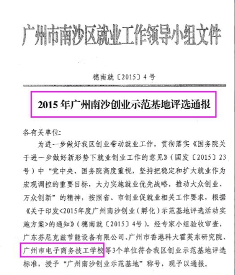 近日,广州市就业服务中心答复、南沙区就业服务工作领导小组发文,我校参评2015年市、区创业孵化基地顺利获得通过。