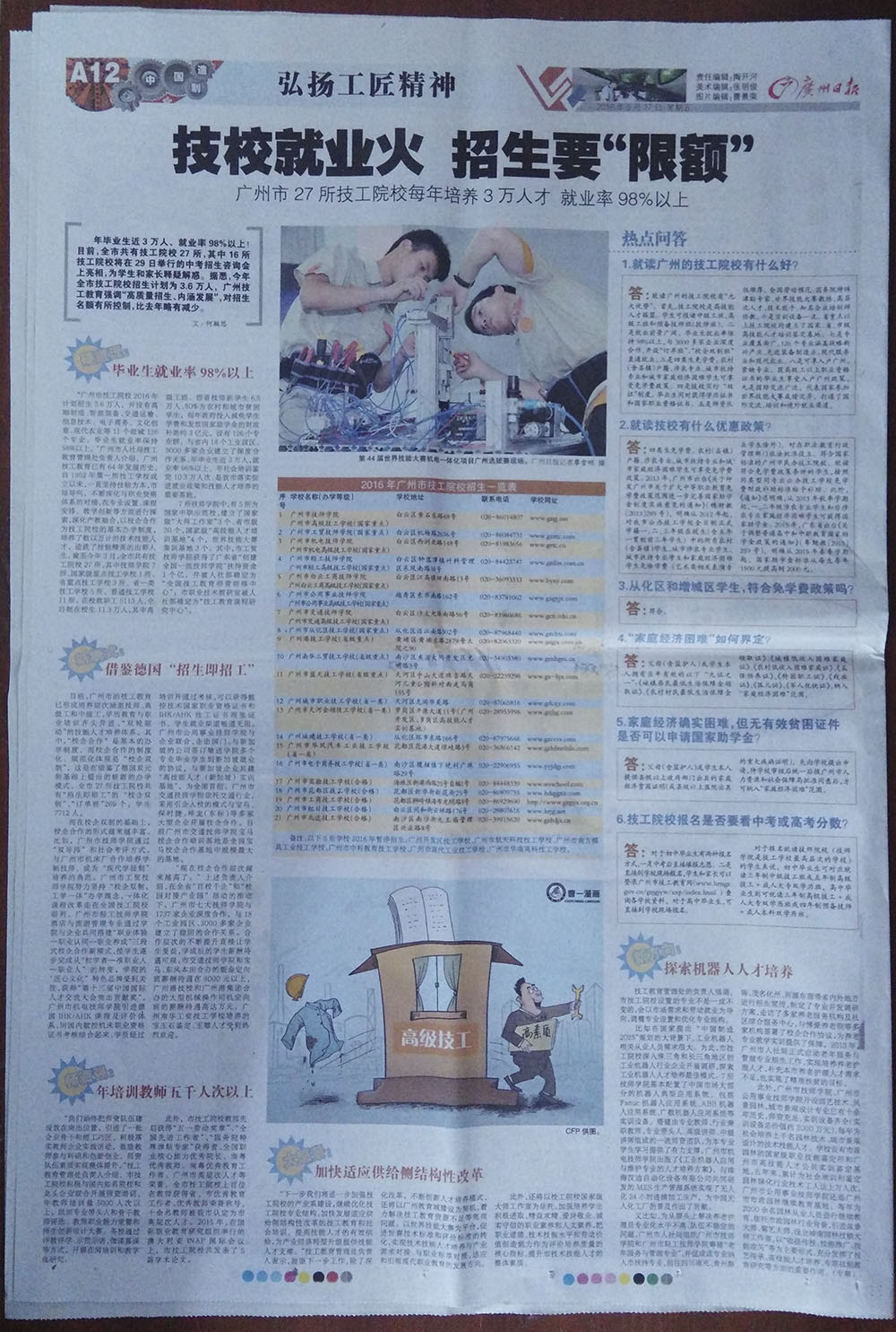 “广州市技工院校2016年计划招生3.6万人,开设有高端制造、智能装备、交通运输、信息技术、电子商务、文化创意、现代农业等11个领域126个专业,毕业生就业率保持98%以上。”广州市人社局技工教育管理处负责人介绍,广州技工教育已有64年发展历史,自1952年第一所技工学校成立以来,一直坚持技能为本,市场导向,不断深化与职业资格体系的对接,在专业设置、课程安排、教学创新等方面进行探索,深化产教融合,以校企合作为技工院校的基本办学制度,培养了数以万计的技术技能人才,造就了技能精英的出彩人生。截至今年3月,全市共有在校教职工5113人,全日制在校生11.3万人,其中高级工班、预备技师班学生6.5万人,80%为农村和城市贫困学生,每年政府投入减免学生学费和发放国家助学金的财政补助约3亿元,设有126个专业群,与省内18个工业园区、3000多家企业建立了深度合作关系,年毕业生近3万人,就业率98%以上,年社会培训鉴定10.3万人次,是我市落实促进就业政策和技能人才培养的重要基地。