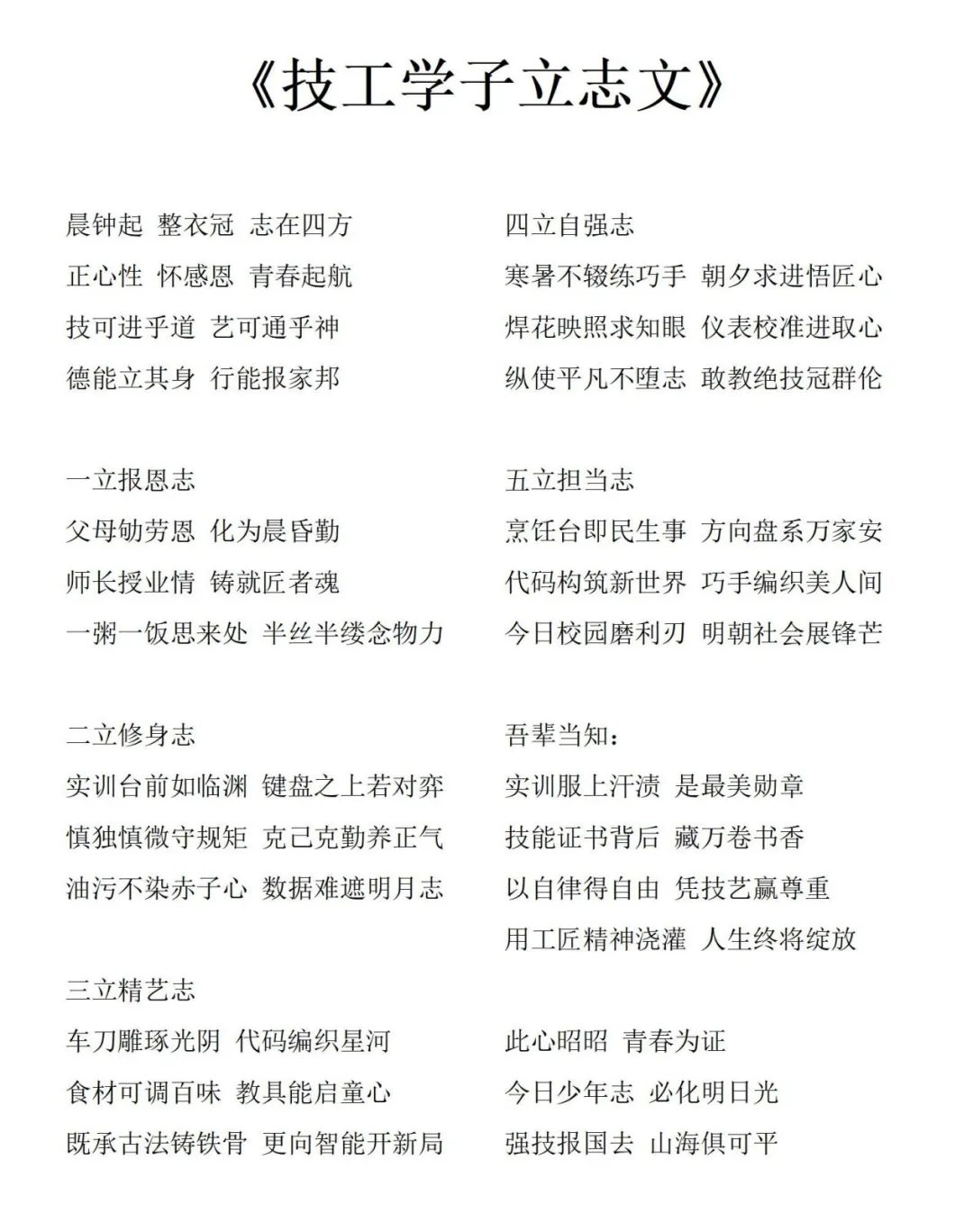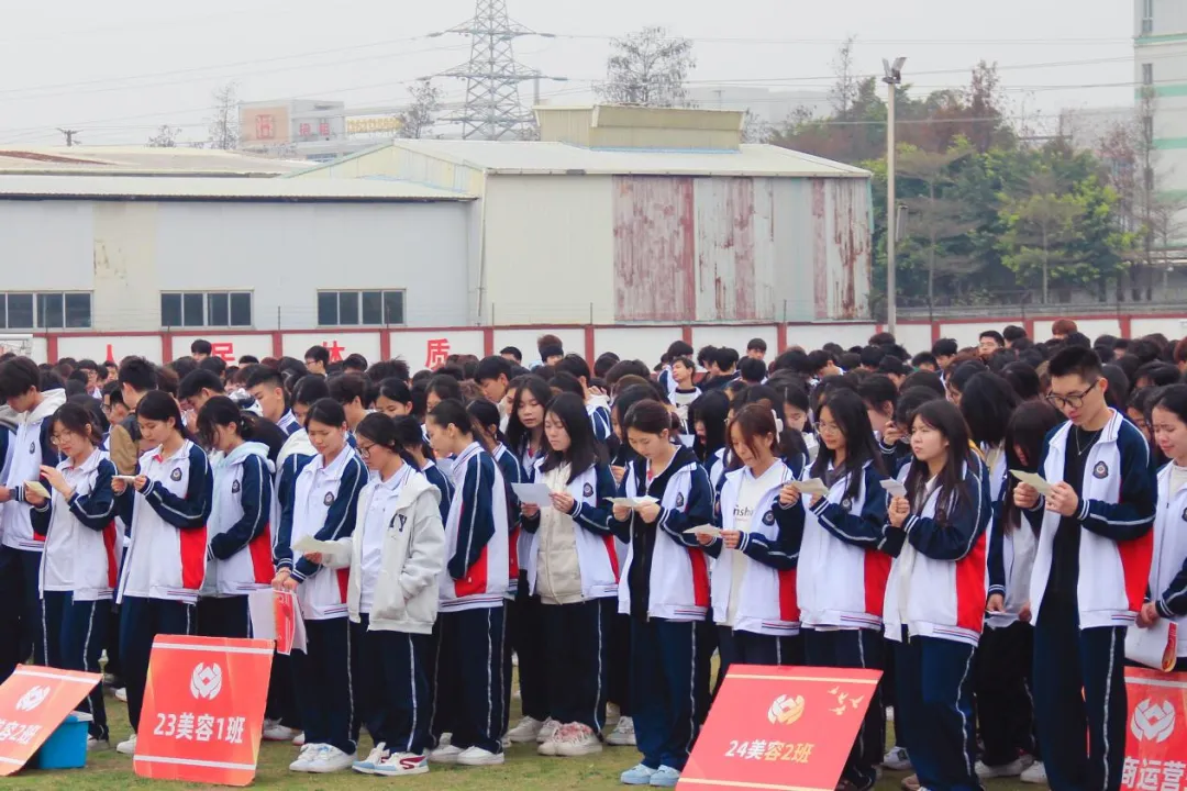 以誓言铭初心 以行动践使命在团委邓翠婷老师的领诵下,全体师生齐声诵读气势恢宏的《技工学子立志文》。从"一立报恩志"到"五立担当志",字字铿锵的誓言回荡礼堂,将典礼推向高潮。"实训服上的汗渍是最美勋章,技能证书背后藏万卷书香"——这不仅是镌刻在墙上的校训,更是每个广电商子内化于心、外化于行的成长信条。