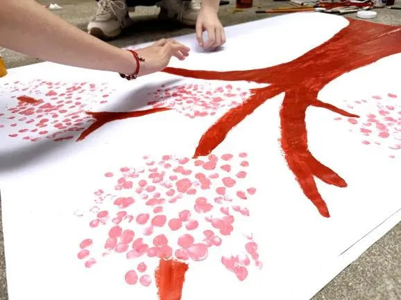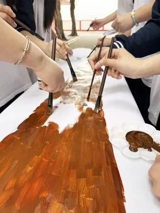 经过一个半小时的协同创作,长卷逐渐绽放出生机:青青的小草幼苗破土与形态各异的森林相映成趣。特别亮眼的是第十小组,她们将泥土融入颜料中调制的"大地色系",将环保理念贯穿创作全程。