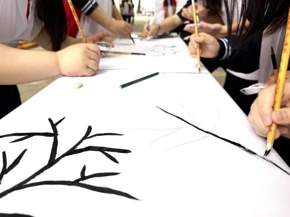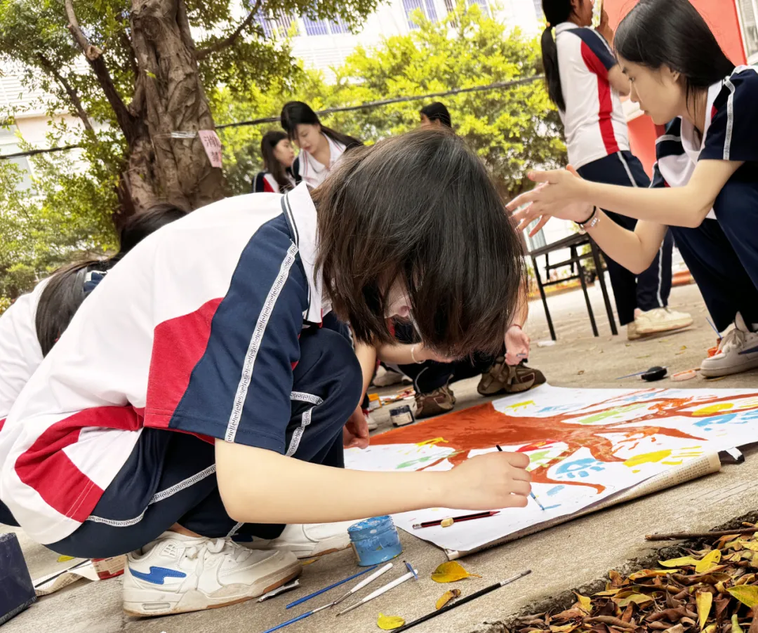 活动当天,长长的环保画纸在后花园铺展,各组同学手持绘画工具与创作方案严阵以待。当画笔接触画纸的瞬间,挑战也随之而来:第三组调配的翠绿色因水分过多晕染出界,第七组设计的大树与相邻构图产生冲突。在教师"以问题为导向"的引导下,同学们现场成立"色彩攻坚队"调试颜料配比,通过小组商议现场调整画面布局,将意外转化为创意。