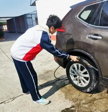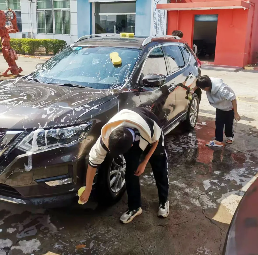 "车窗密封条要用软毛刷逐寸清理,这是很多车主都容易忽视的细节。"冼老师对擦拭后视镜的同学讲解。志愿者们通过小组合作,齐心协力,让每辆车都实现从引擎盖到排气管的全方位焕新,连车灯缝隙都闪耀着专业光芒。