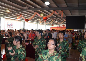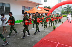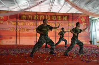 通过打造植入“黄埔精神”和“西点模式”的“南方铁军特训营”,达到培养、锻炼学生钢铁般的军人特质,帮助企业培养一支支符合其需求的钢铁将士队伍的目的。图为特训营教官进行士气展示。