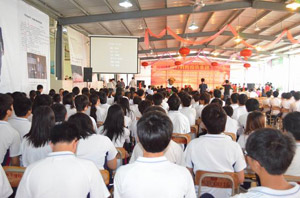 领导罗四林先生、嘉宾周湛文先生上台为校庆祝贺致辞