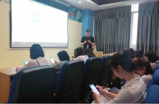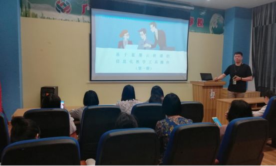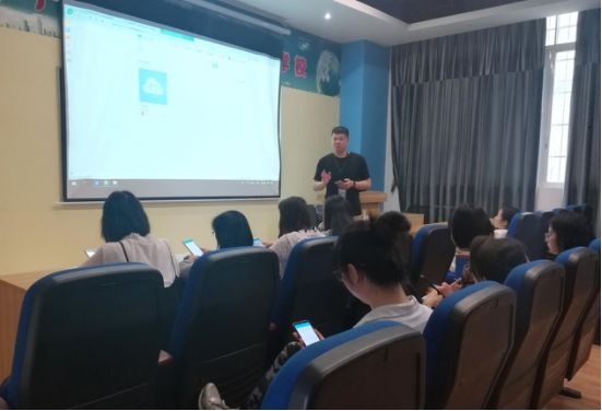在培训课上,杜老师介绍蓝墨云班课是蓝墨科技推出的一款移动教学助手APP,是在移动网络环境下,利用移动智能设备开展课堂内外即时反馈互动教学的云服务平台,将课堂教学从传统教学直接升级到了互联网+教学模式。并现场组建了一个班课,教师们通过班课邀请码进入云课堂学习。杜老师让参训教师们以学生的身份体验了蓝墨云班课签到、调查问卷、头脑风暴、资源管理等功能,并介绍了在电脑端查看课堂表现、班课明细数据、班课教学报告等功能的方法。随后进行分组任务学习活动,让参训教师转换成教师身份分别建立班课进行实际操作,遇到问题及时解答。