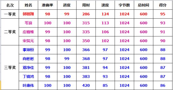 因为本次比赛是经过前期的初赛,从每班选出前三名的同学,才进入今天的决赛。经过一场紧张而激烈的速度之争,18级新生郭翊翔以124字/min的优异成绩获得第一名。此次学生的文字录入水平总体还是非常不错的,正确率保持在98%以上,速度介于60-120字/min 之间。