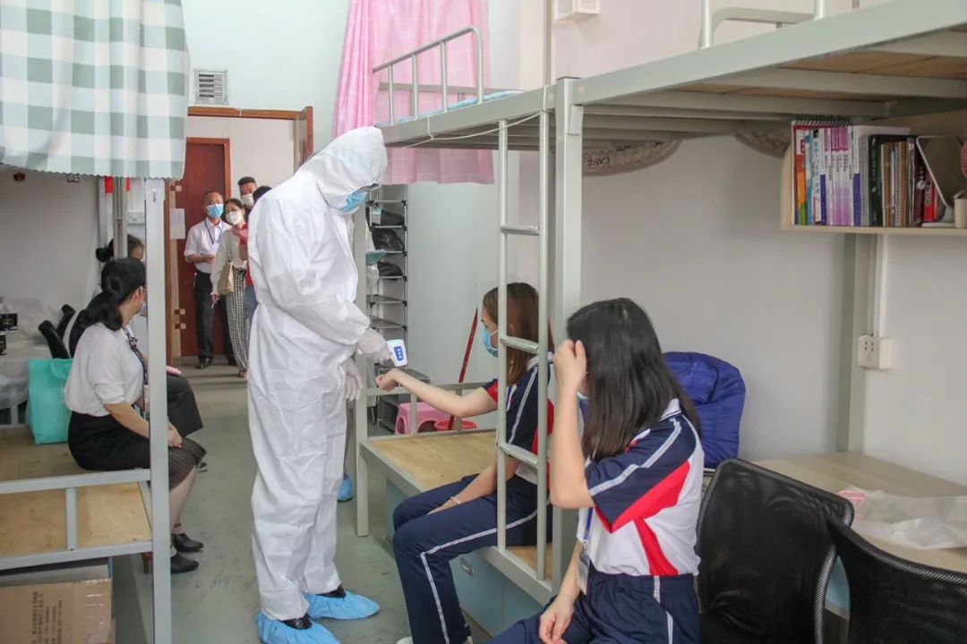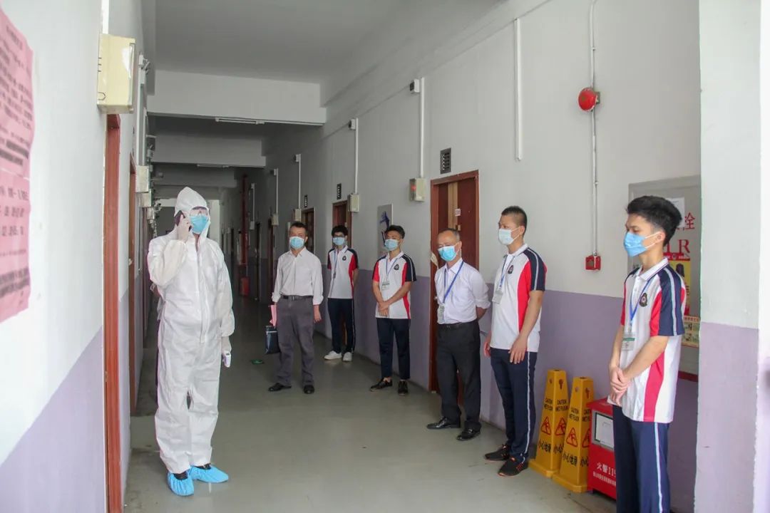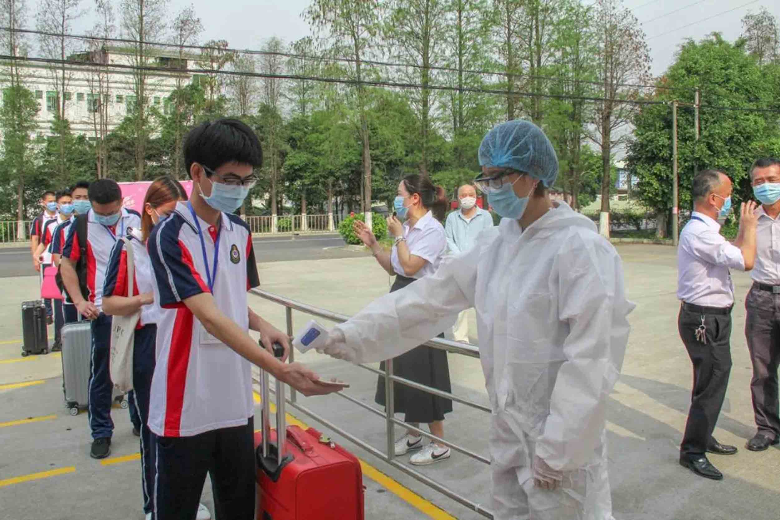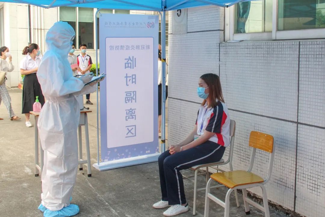 模拟学生分批返校,发现学生体温有异常现象等 学生分批返校,按指定专属通道排队,体温监测组的老师提前在校门进行消毒、体温检测,查看穗康码和登记等工作。学生进入校门后,还要进行行李消毒、洗手、换口罩后方可进入校园在演练中,发现一名学生在体温检测过程中出现异常,将该生带往校门口临时隔离室进行进一步的询问与诊断,确定情况。