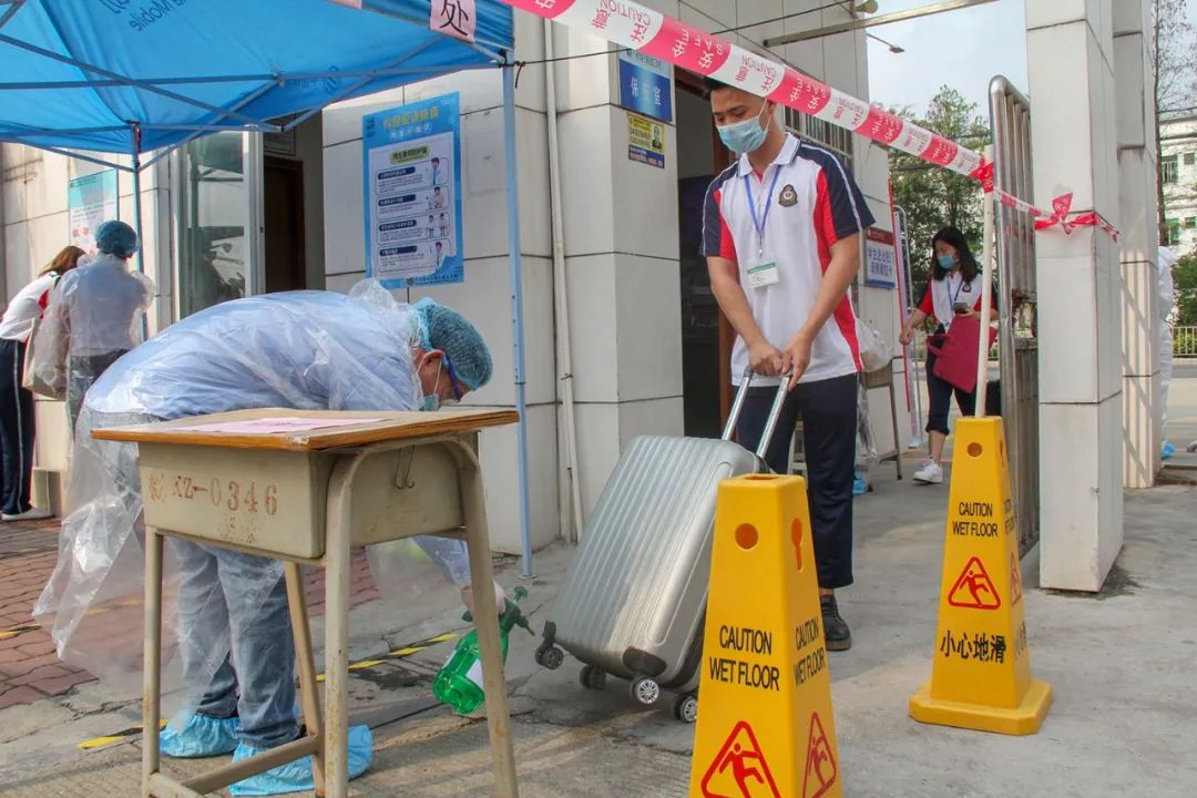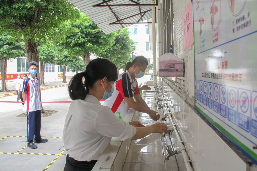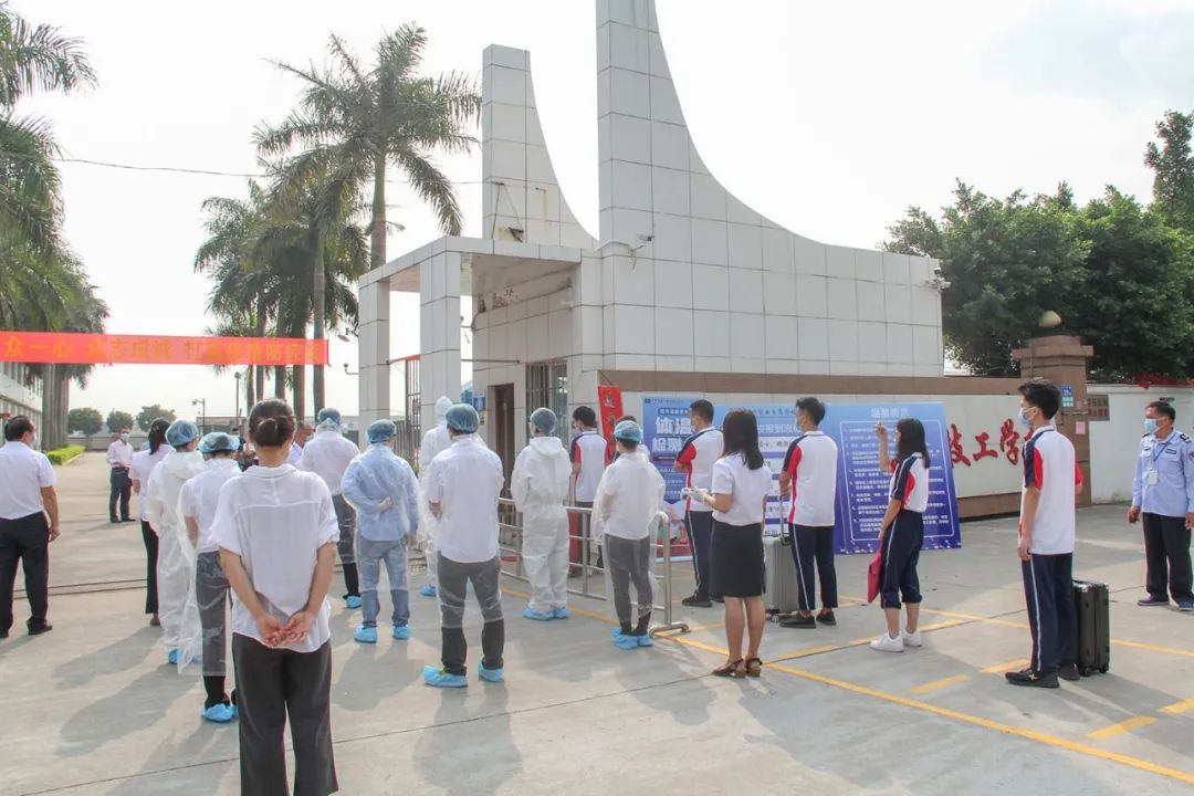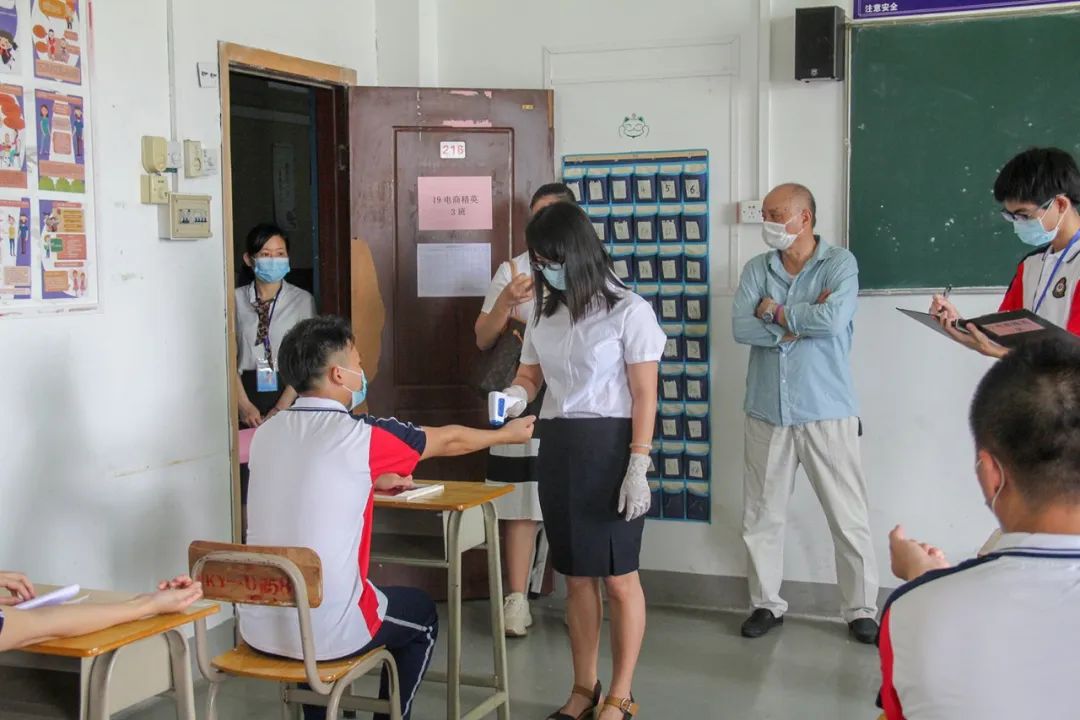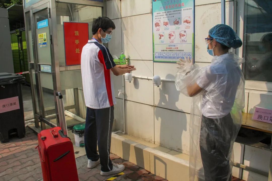 模拟学生分批返校,发现学生体温有异常现象等 学生分批返校,按指定专属通道排队,体温监测组的老师提前在校门进行消毒、体温检测,查看穗康码和登记等工作。学生进入校门后,还要进行行李消毒、洗手、换口罩后方可进入校园在演练中,发现一名学生在体温检测过程中出现异常,将该生带往校门口临时隔离室进行进一步的询问与诊断,确定情况。