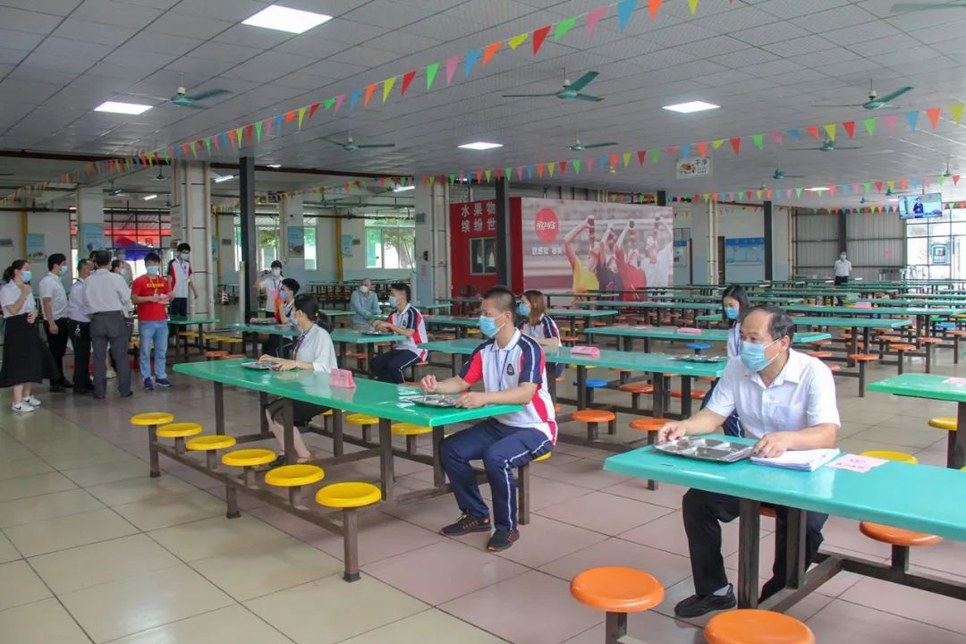 进入饭堂区域前所有师生需按间隔排队接受体温检测,体温正常统一排队洗手,再统一取餐,取餐时需间隔1米排队。工作人员有序向排队学生进行指引。