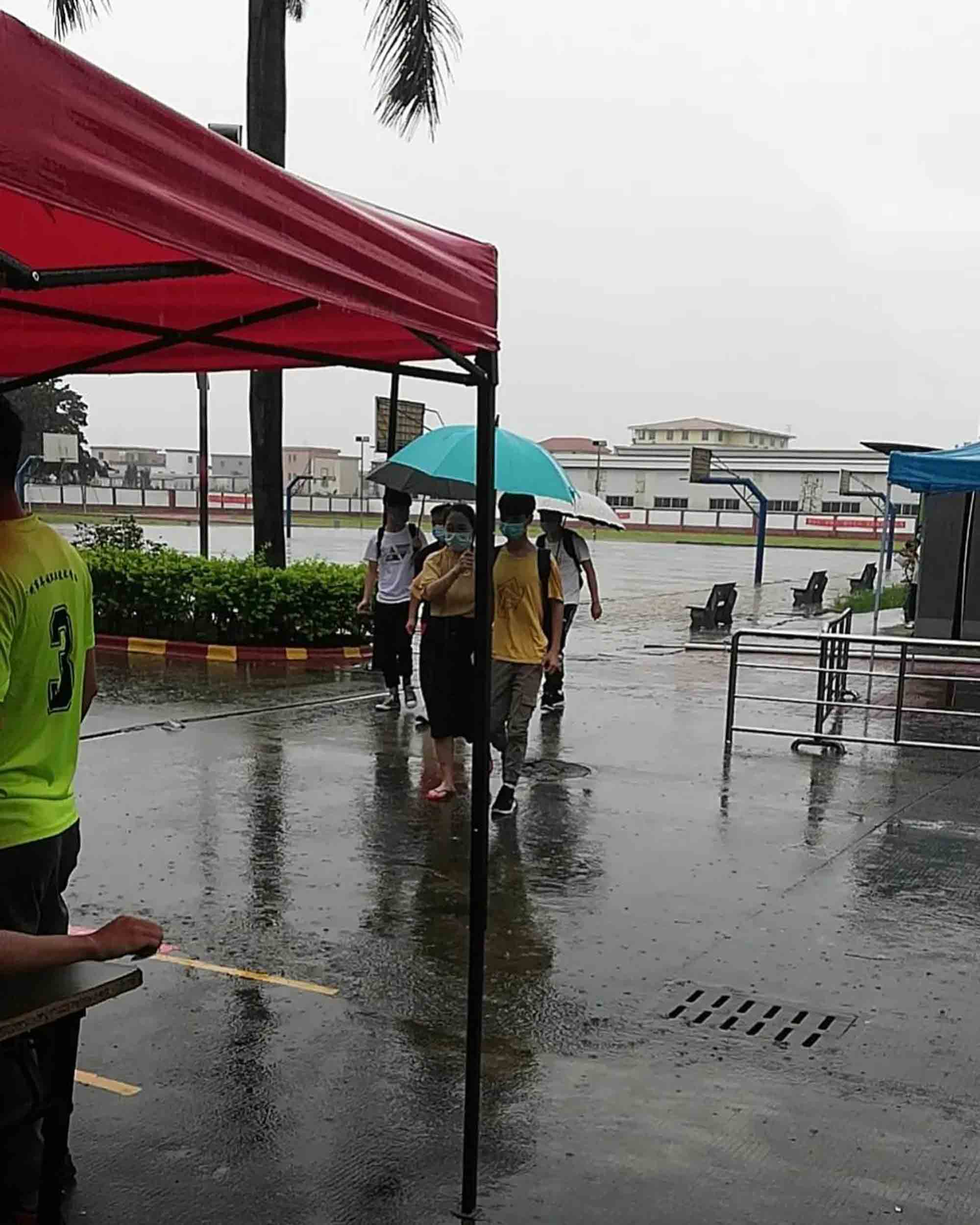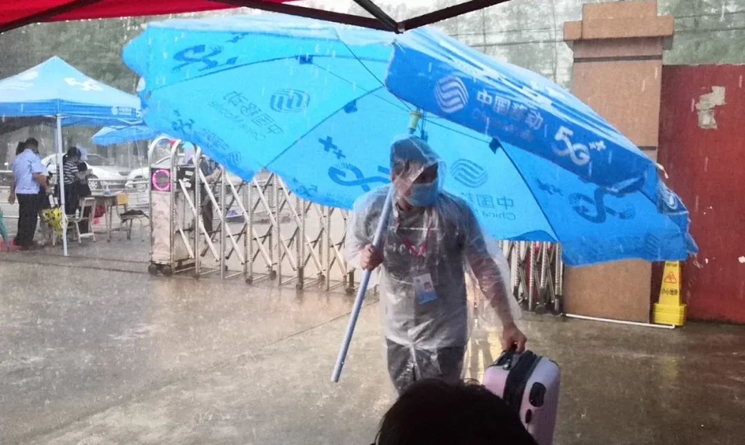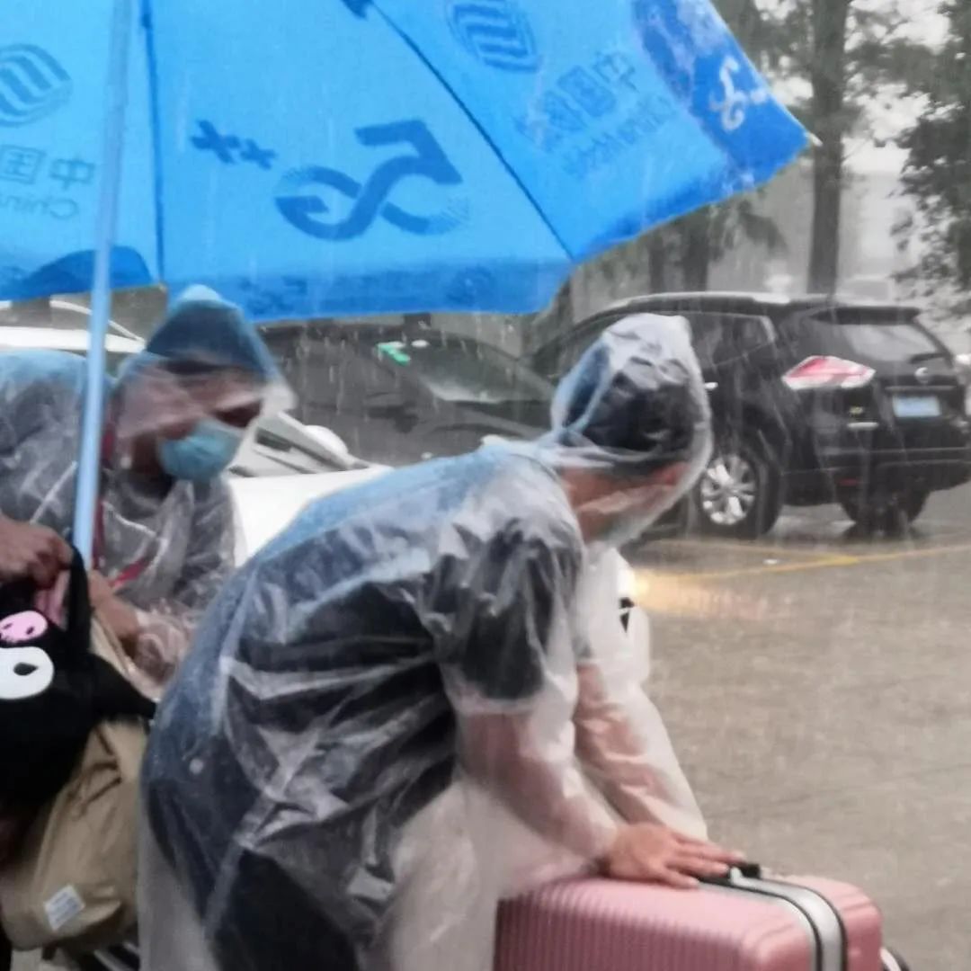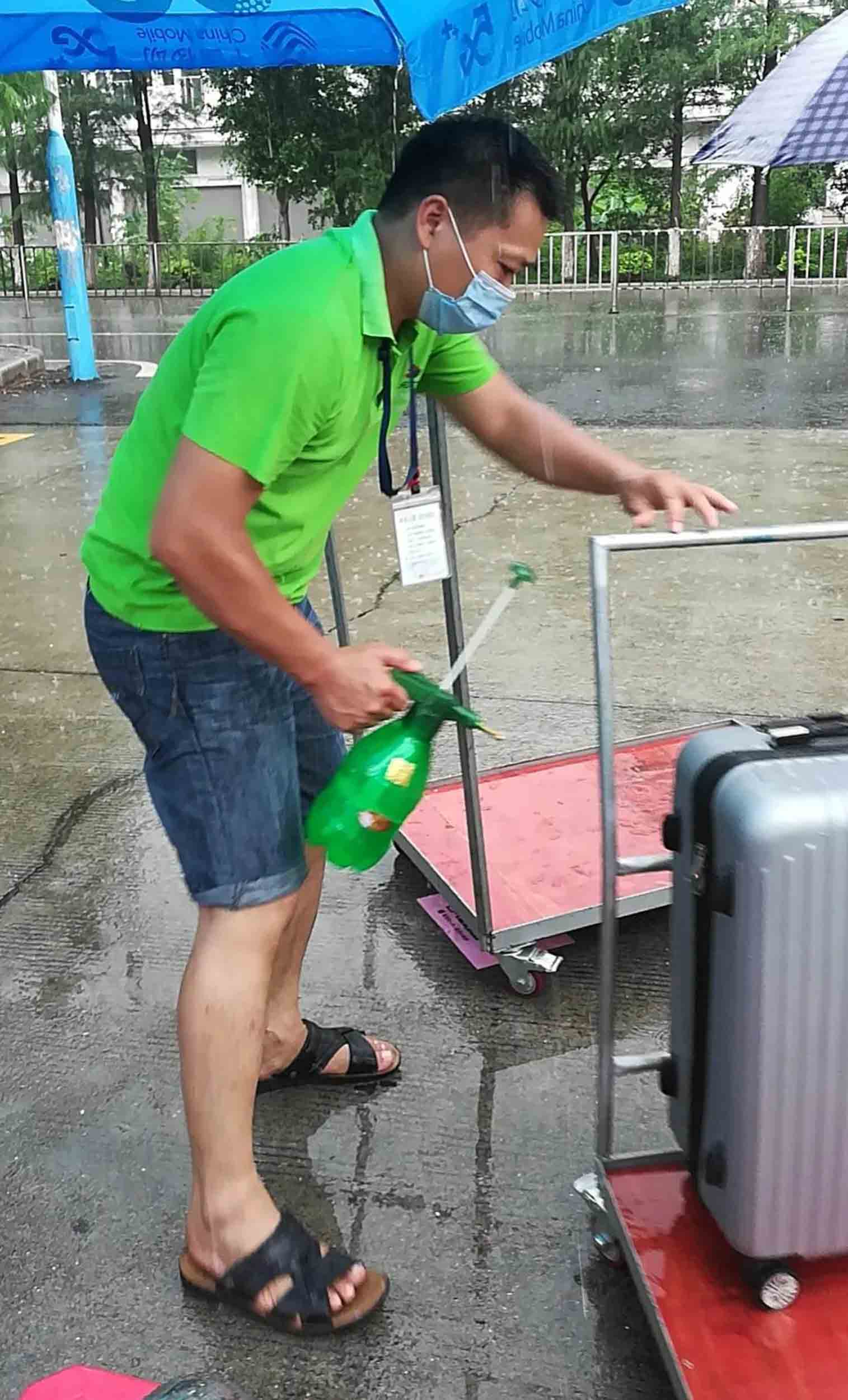 暴雨无情,教师有爱。尽管这场雨来的突然,但学生返校工作仍然在有序进行中。消毒组的老师浑身湿透,却不蔽风雨、不惧艰辛,仔细的对学生的每一件行李进行消毒工作,切实保障每名学生的安全。