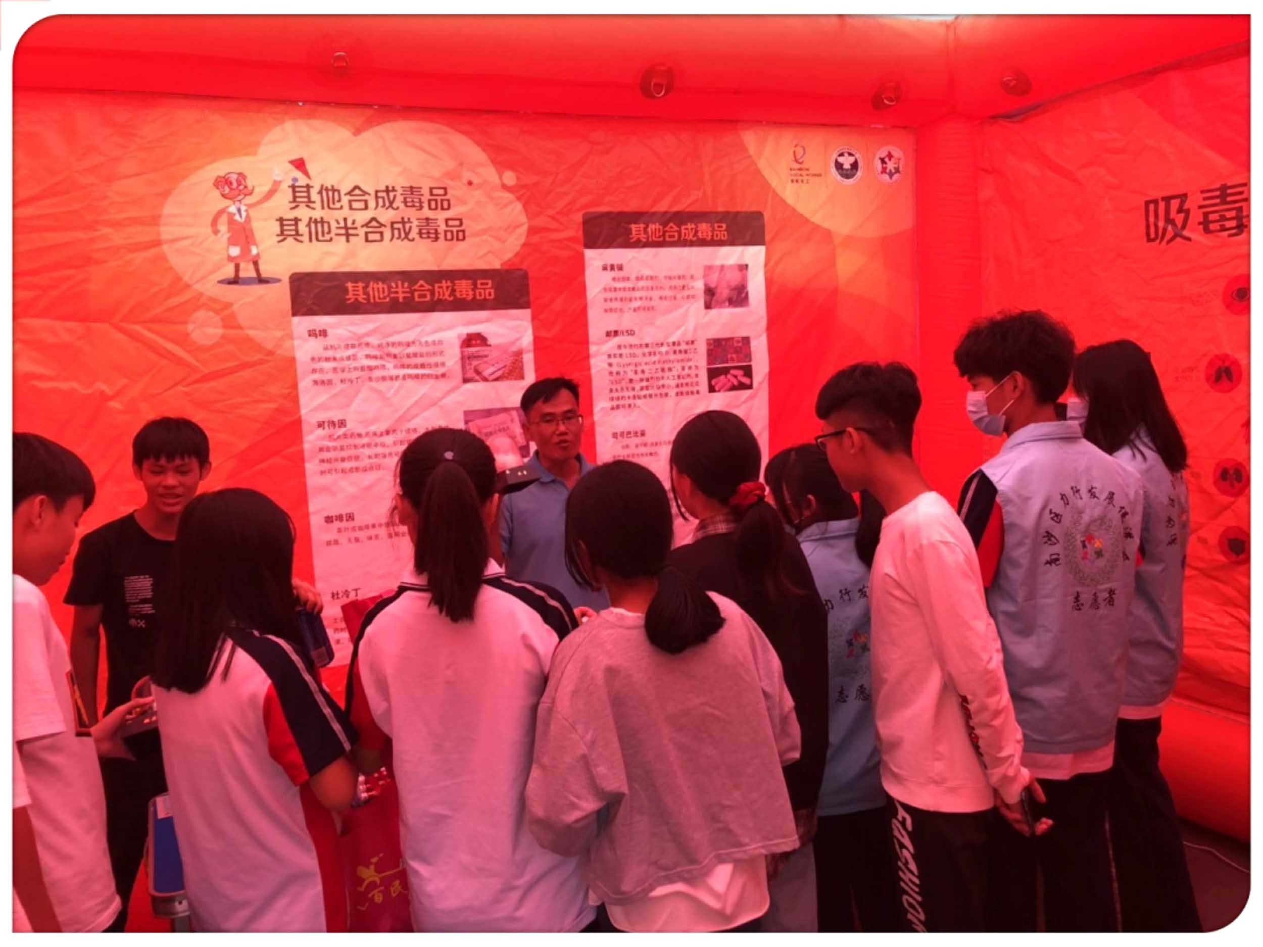 为进一步加强我校青少年禁毒预防教育工作,近日,我校与南沙区榄核镇禁毒办携手南沙区力行促进会开展了一场以“禁毒新体验、护航青春梦”为主题的“反毒大篷车”进校园宣传活动。这次活动以“反毒大篷车”青少年移动禁毒教育基地为载体,在“教学”与“体验”相结合的过程中,让学生从听、说、看、体验四个维度“零”距离感受到毒品的巨大危害,促进参与活动的学生对毒品有全方位的认识和了解。这次活动主要分为两大部分。