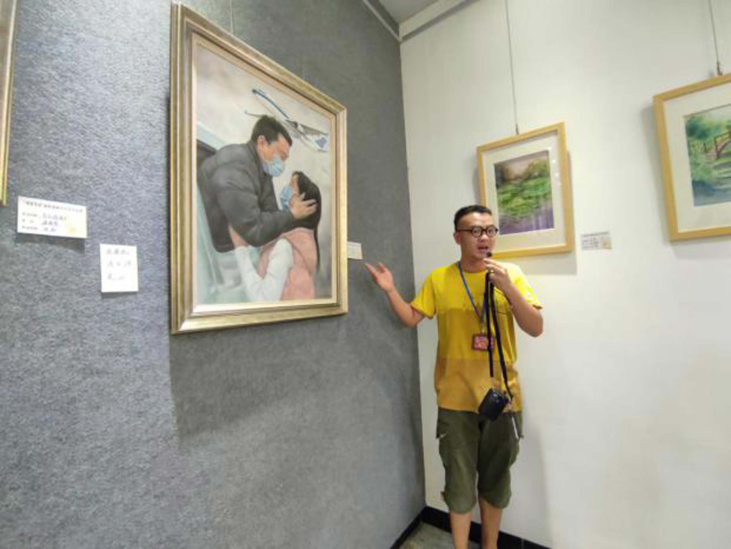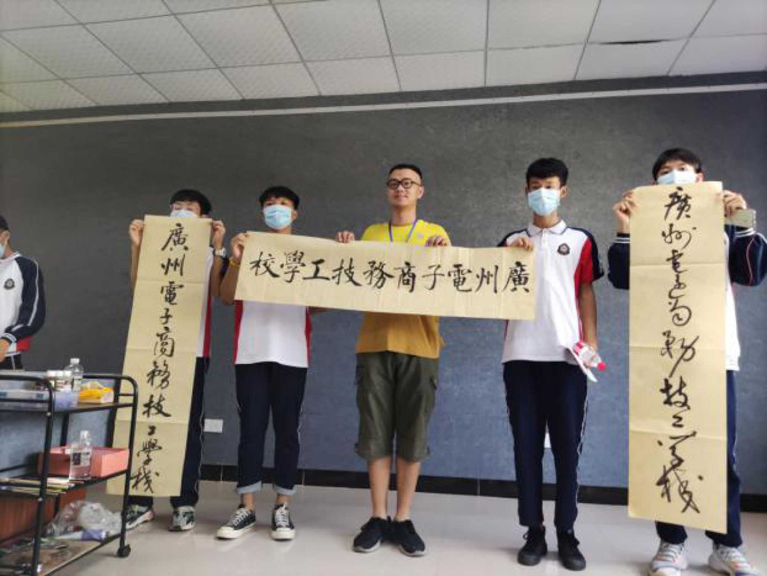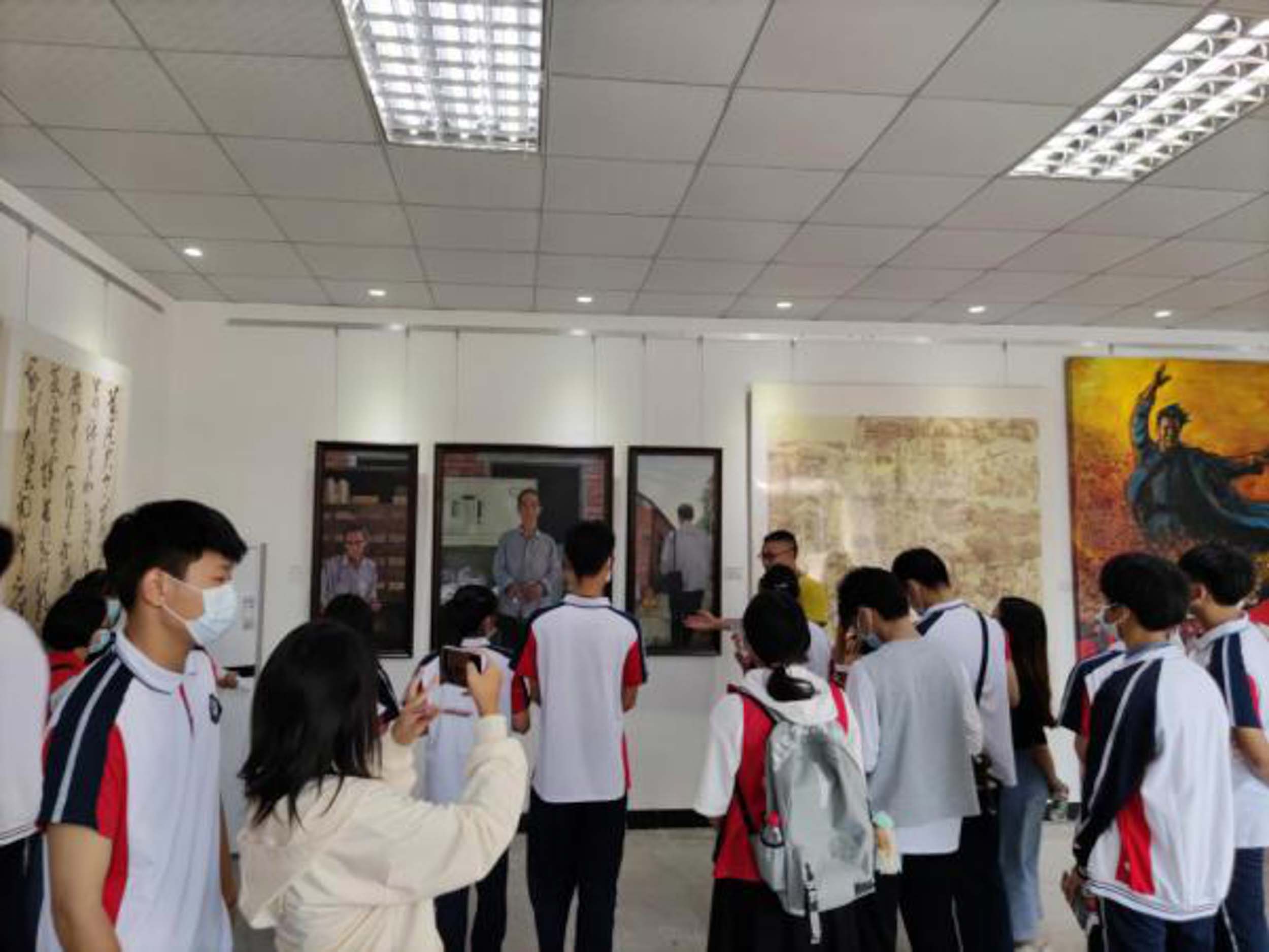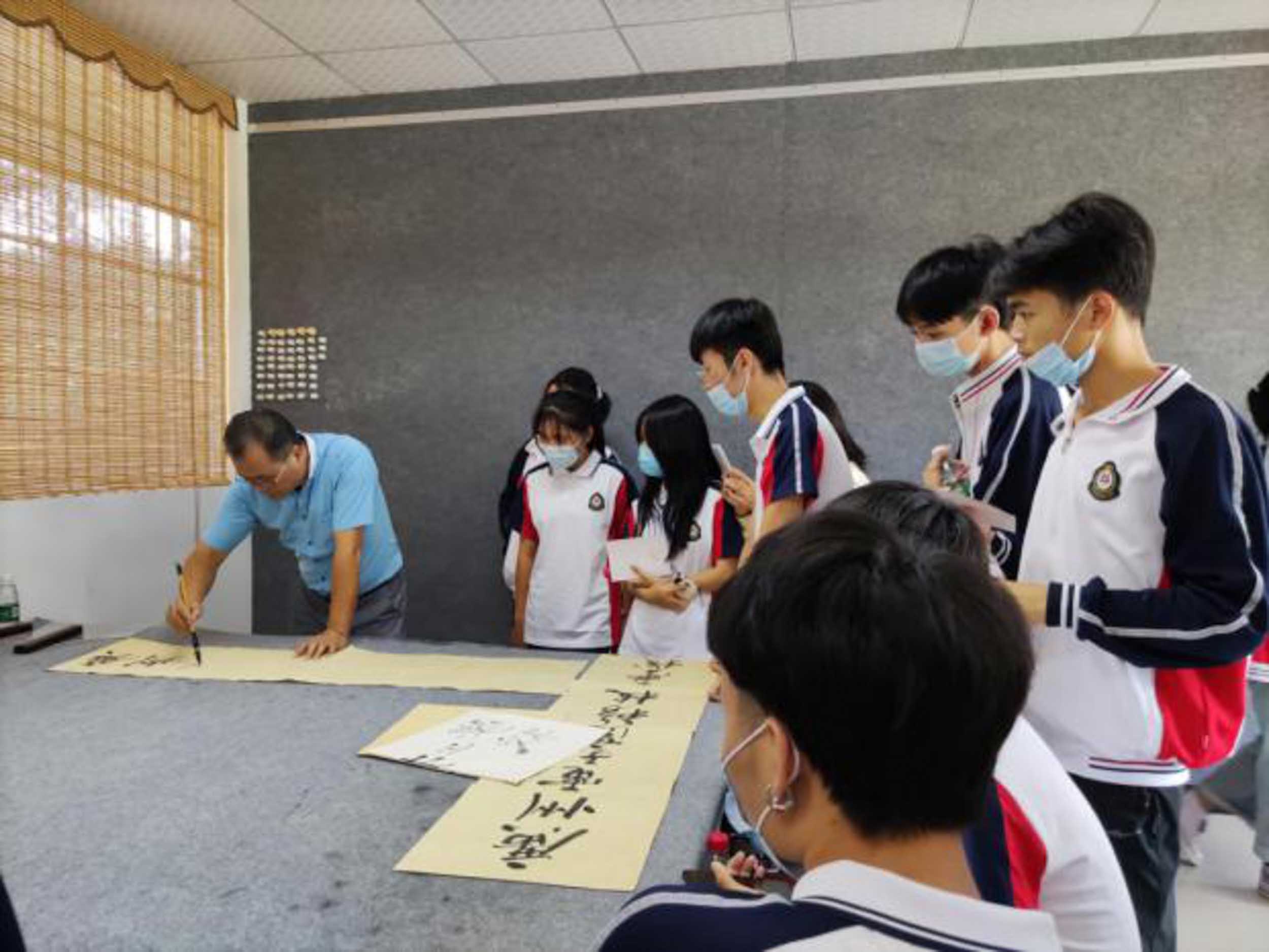 紧接着,我们参观了榄核美好生活艺术作品展。该作品展分为三个主题,分别是抗疫主题、榄核山水主题和传统水墨主题。不仅如此,主题馆的林嵩老师当场提笔写书法,送给前来参观和学习的学生。同时,在馆内工作人员的带领下,同学们第一次近距离地接触到了“榄核三宝”之一的香云纱,并了解到它的特质和制作过程,给他们上了生动的一课。