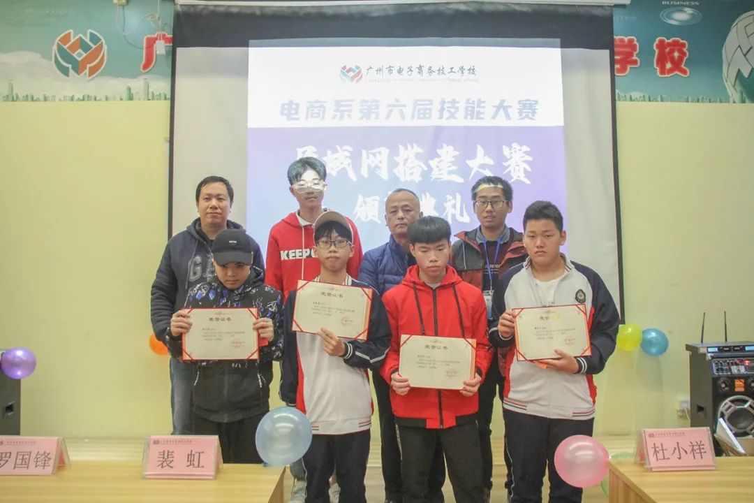 本次有6个小组共30名同学报名局域网组建大赛,经过激烈的角逐,最终由 19计网2班的李哲俊、苏游荣、谢凡林、黎浩杰、丘祥斌五位同学获得一等奖;19计网1班 魏茂城 张博 黄耿鑫 廖明钰 黄汉森五位同学获得二等奖;20计网1班 梁桓铭 周海云 邱雨朋 李鹏 姚柳宇和19计网2班 李泽贤 苏沅溪 刘振涛 刘华龙 郑炫章等10位同学获得三等奖。程翔、王绍强、卢佳康三位老师获得局域网组建大赛优秀指导老师奖。