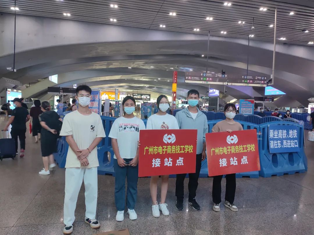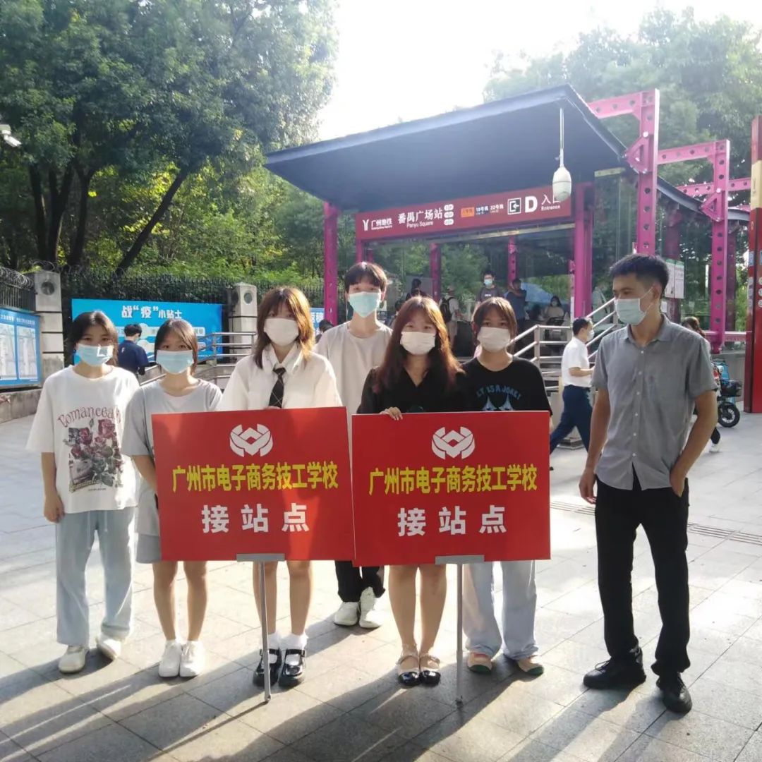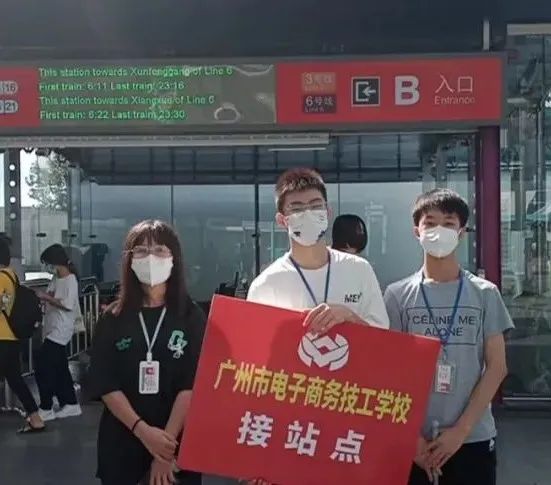为了迎接新同学,迎新工作人员在天河客运站、广州南站、番禺广场地铁口设好新生接待点。