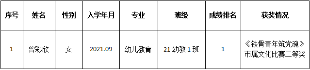 学生曾彩欣,就读于广州市电子商务技工学校幼儿教育专业,21幼教1班,作为一名优秀的共青团员,在校期间在班级担任班长职务,辅助学校及班主任管理班级工作,并在2021-2022学年第一学期被评为“优秀班干”。此外,始终以严谨认真的态度对待学习,堂学习上从不迟到、不缺勤,积极配合老师所交代的任务,不断努力提升自我,保持优异成绩,在班级乃至全年级中名列前茅。课余时间积极参与学校的各项比赛活动,在2022元旦文艺晚会参与舞蹈节目《夜竹·朝露》并获得优秀奖。通过对自身的严格要求以及指导老师的倾心指导下,参与了广州市职业技能教研会举办的红色文化节比赛,通过《铁骨青年筑党魂》并荣获二等奖的好成绩。