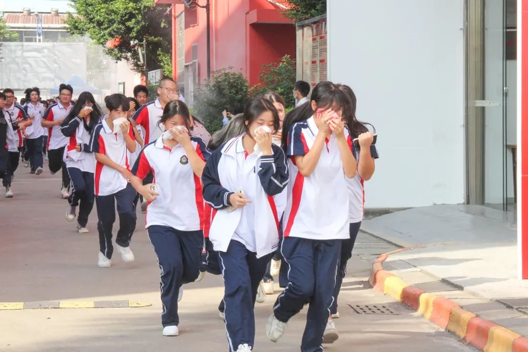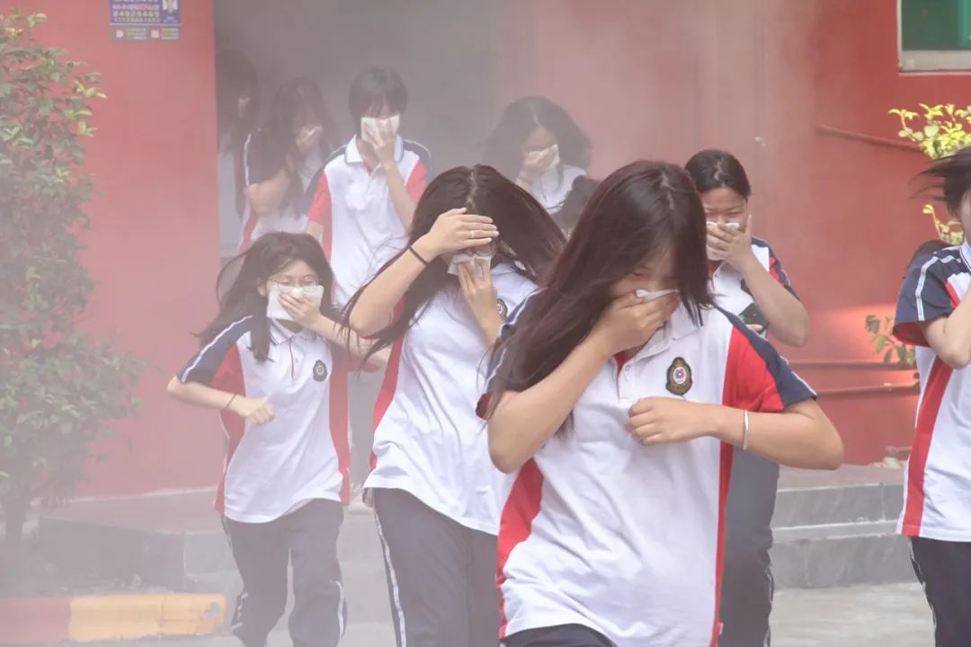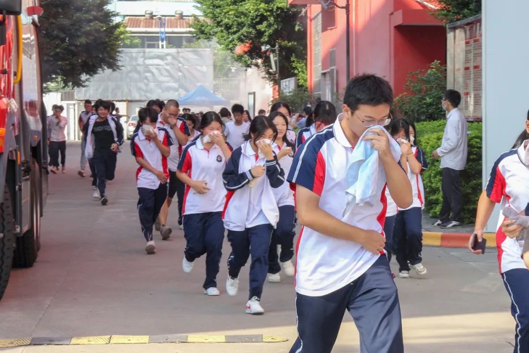 下午14:30分,随着火灾应急疏散预警信号响起,消防演练正式开始。各宿舍的学生在各楼层负责老师的指挥下,捂好口鼻、弯下腰,扶着楼梯和墙壁穿过浓烟,争分夺秒地从宿舍楼撤离。在最短的时间内全部迅速撤离宿舍,按照预定的疏散路线,安全而有序地通过楼道,撤离到学校指定的安全区域。