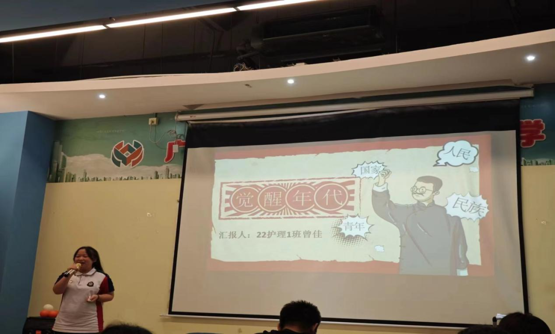 22护理1班的曾佳同学为我们分享了影视剧《觉醒年代》,讲述了在五四时期一群仁人志士为了带领中国摆脱困境而努力奋斗甚至不惜献出生命,告诉我们今天幸福生活的来之不易。