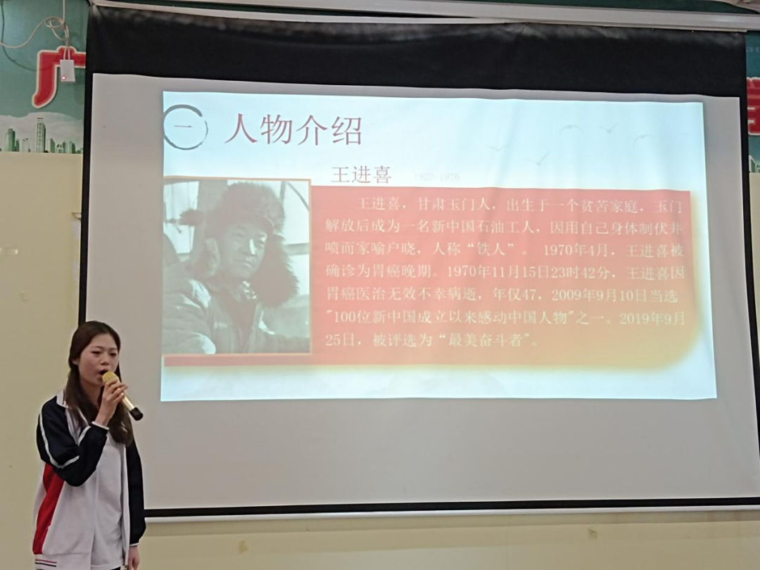 22电商创业班的邹菲同学分享了中国石油工人铁人王进喜的英雄事迹。