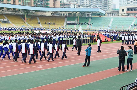 比赛当天,我校选手们蓄势待发,以饱满的精神出现在广东省人民体育场检阅队伍中