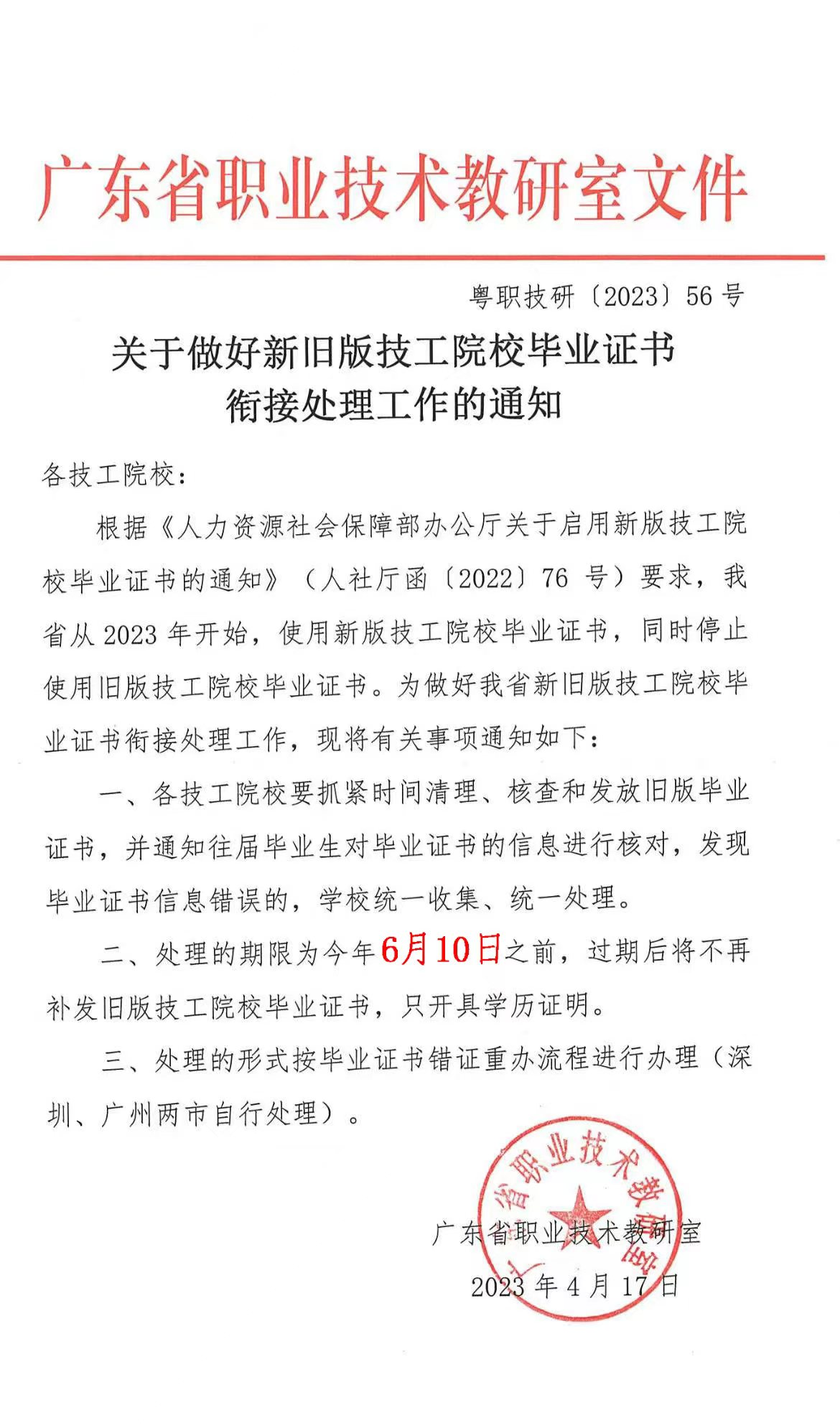 接上级通知,由于毕业证书进行新旧版本替换,因此在6月10日后学校不再接收旧毕业证书错证补办业务,只开具毕业证明。请未领取毕业证的往届生于2023年5月31日前到校领取,并且核实是否毕业证书有误!如2023年6月10日后领取毕业证并发现有误的学生,学校无法再进行补办改证处理,